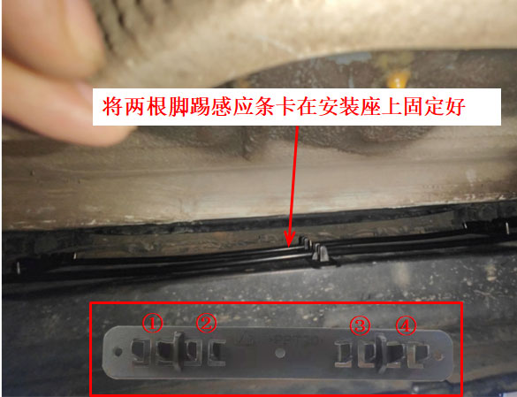 4、用自攻螺釘從保險(xiǎn)杠底部往上擰到車(chē)內(nèi),固定腳踢感應(yīng)條安裝座。