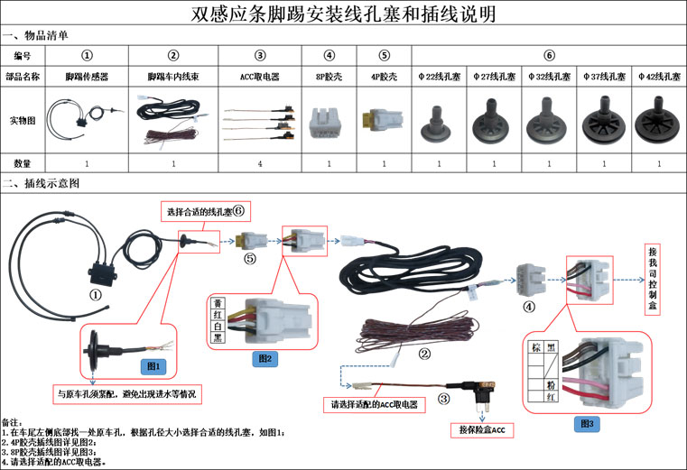 13、腳踢預(yù)留4種ACC取電器,選擇合適的取電器插入保險(xiǎn)盒。