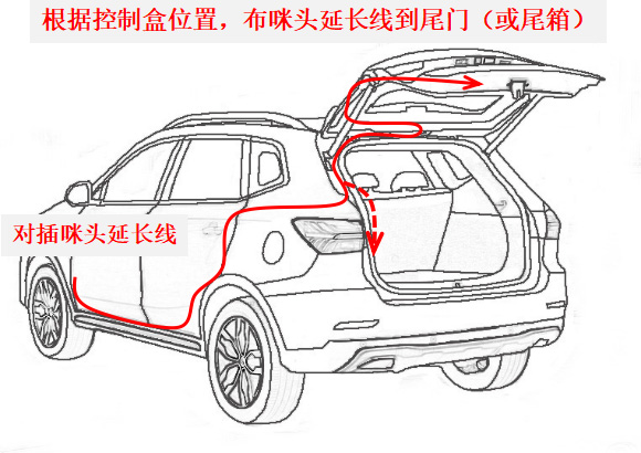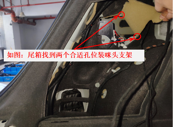 5、在尾門控制盒附近,找兩個合適孔位,裝好咪頭支架【先將咪頭裝在支架上】。